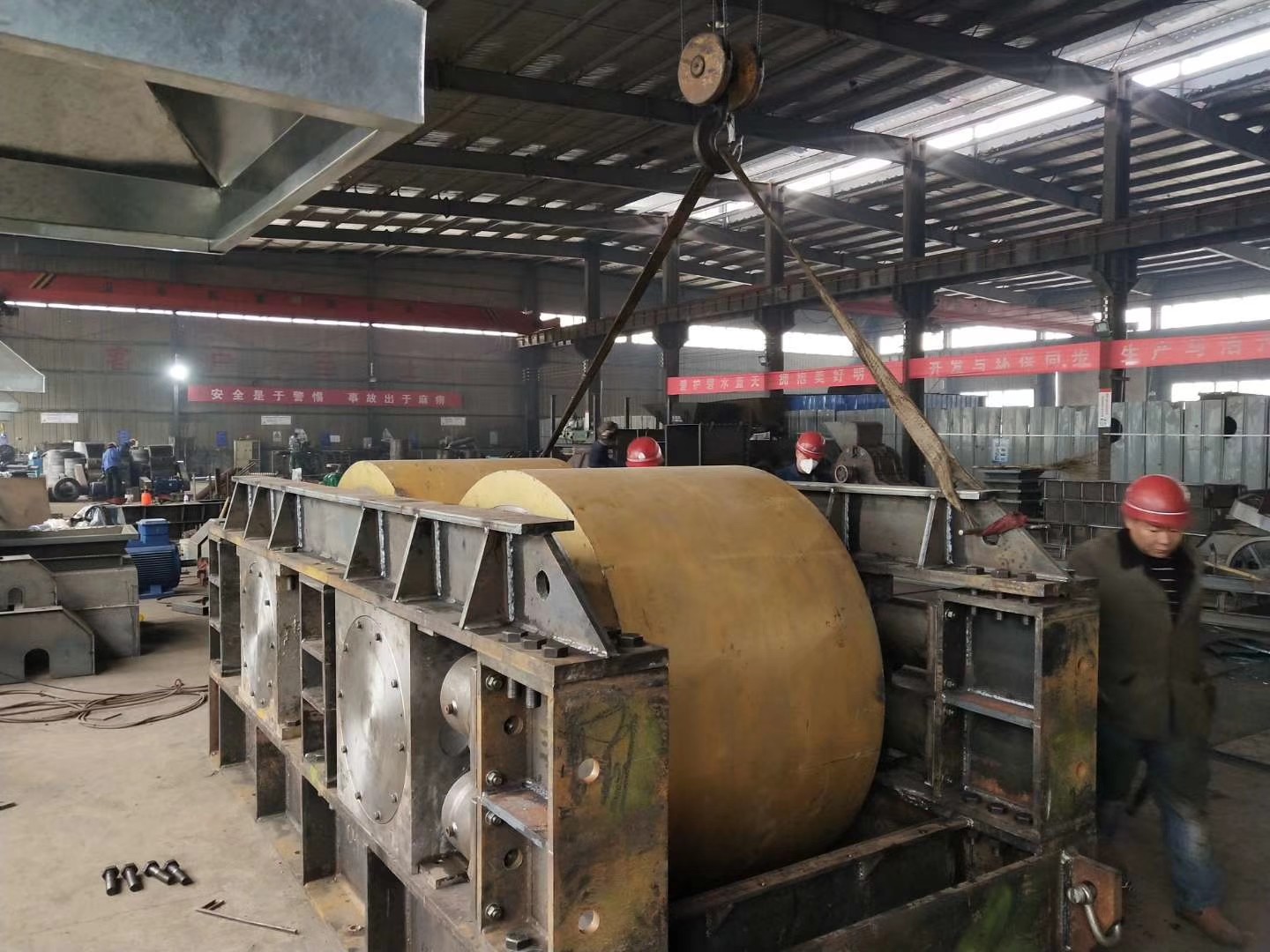 Dois motores conduzem dois rolos para correr na alta velocidade, o material entra da boca de alimentação e colide com os dois rolos. Os dois rolos movem-se em sentidos opostos ao mesmo tempo, de modo que o material seja quebrado no tamanho de descarregamento exigido.