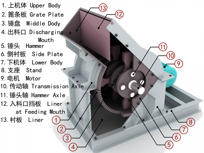 In the hammer crusher mill machine,the motor drives the rotor to rotate at a high speed through the belt,and on the rotor there are series of hammers.when the material get into the working area of hammers,the rotating hammers with high rotation speed are crushing the material,the crushed product meeting the required size can be discharged by the outlet and become the final prodcuts,the large size prdocut are brought back to the crushing area by the hammers for being re-crushed until they reached the required size.