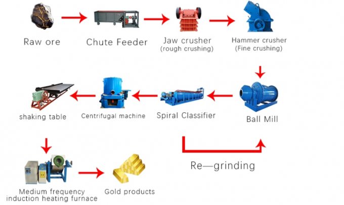 For the rein gold ore, it will go through the crushing, grinding, screening and gravity separation, in which the needed equipment include jaw crusher or hammer crusher (depends on the hardness of the ore), ball mill or wet pan mill, spiral classifier, centrifugal concentrator, shaking table, almagamation mercury mixer and gold electric furnace.