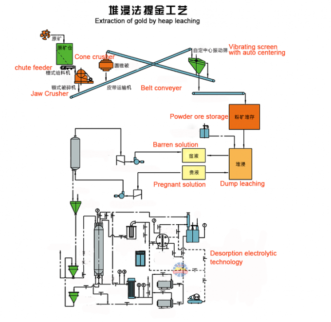 E. Pregnant solution goes through adsorption, desorbing and electrolysis, then gets gold mud. After melting, gold mud becomes gold spindle.